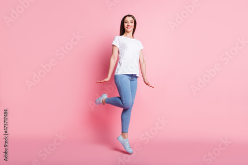 Full length body size photo girl happy smiling jumping careless isolated pastel pink color background