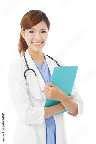 full length young smiling professional Doctor with document