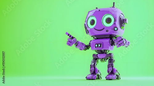Funky Purple Robot with LED Eyes and Happy Face Pointing to the Left, Solid Light Green Background for Fun Tech Product Ads