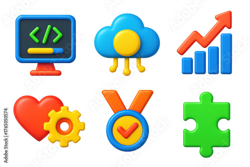 Future Skills Icon Set. 3D icon set of skills for future work: coding in progress icon, cloud computing skill badge, data analysis