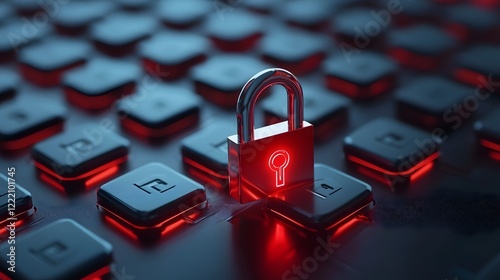 Futuristic 3D depicting advanced network encryption and secure data flow Glowing digital connections complex code patterns