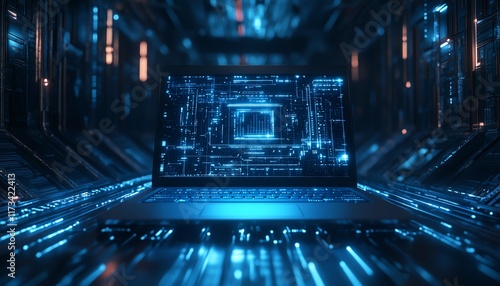 Futuristic abstract laptop, flowchart elements, blue tones, 3D rendering, sleek and dynamic design, hightech visual, digital flowchart details, modern tech look