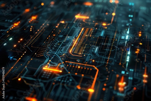 Futuristic abstract technology design with glowing circuits and dark background