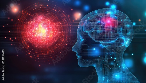 Futuristic AI brain, profile view, abstract data network background. Possible use technology, science