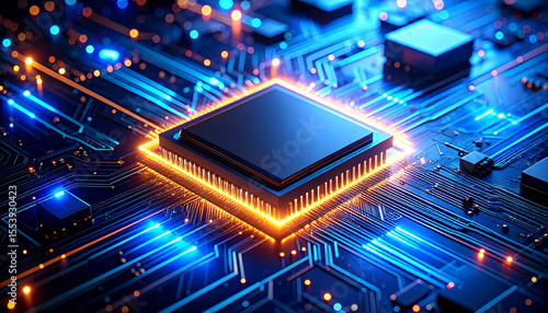 Futuristic AI Chip on Reflective Surface with Copy Space. AI themed Background. Generated Image