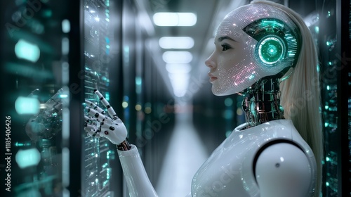 Futuristic AI Robot Woman in Neon Data Center Server Room