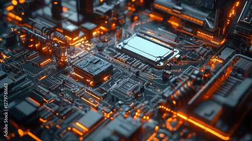 Futuristic AI-powered robotic arm assembling components. AI machine learning concept. Digital 3D chips, technology, hardware. Microchip, motherboard, cpu glowing circuits. AI powered assembling board.