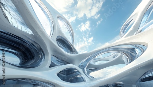 Futuristic architectural facade, interior view, cloudy sky, architectural design