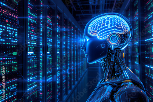 Futuristic artificial intelligence robot with glowing blue brain and data streams in a digital server room