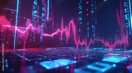 Futuristic audio visualizer displaying colorful graphs and waveforms on a digital interface.