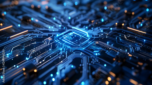 Futuristic blockchain circuit with glowing microchip and vibrant digital network