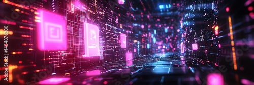 Futuristic blockchain technology background with glowing digital chains and crypto symbols. Dark theme with neon accents, perfect for finance, tech, and cryptocurrency concepts. High-tech and innovati