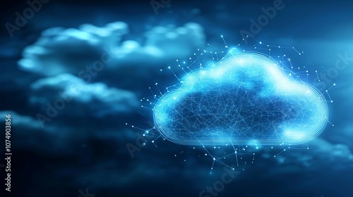 Futuristic blue cloud with digital connections against a dark background.