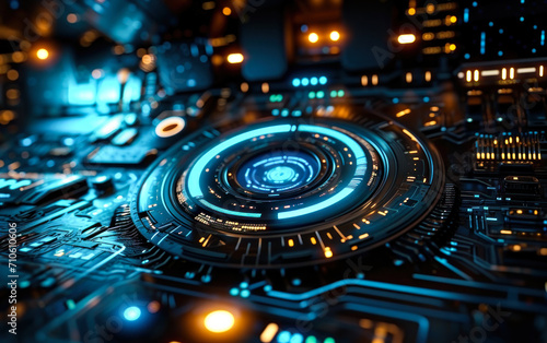 Futuristic blue digital HUD interface with glowing cyber circuit elements, depicting advanced technology, cybersecurity, and modern computing concepts