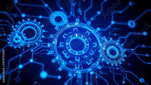 Futuristic blue glowing gears and circuit board technology background image perfect for websites or presentations about innovation and technology.