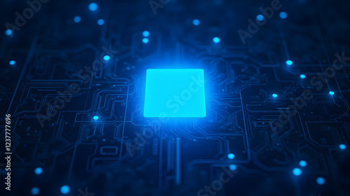 Futuristic blue glowing microchip on dark electronic circuit board background with luminous connections and abstract technological elements