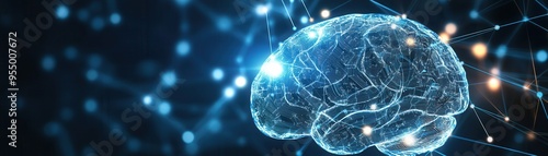 Futuristic brain visualization depicting neural connections and data flow in a glowing, high-tech environment.