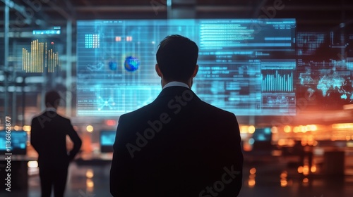 Futuristic Business Technology Hub with Analytics Display in Corporate Environment