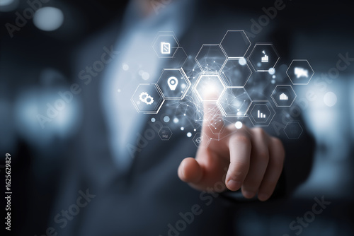 Futuristic businessman hand finger touch virtual screen.