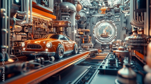 Futuristic car in a high-tech workshop with glowing details
