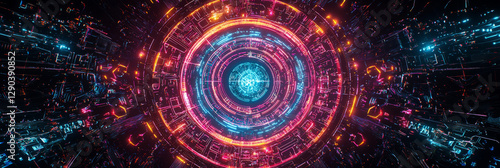 Futuristic circuit board design with glowing circular lines and interconnected nodes, tech background