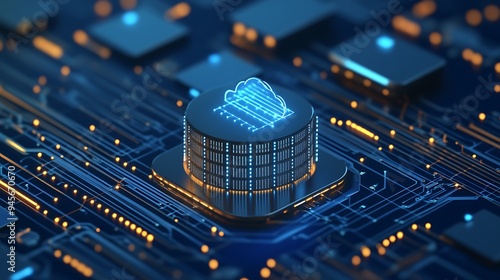 Futuristic circuit board with cloud server hologram. Concept of cloud computing, data storage, and advanced technology.