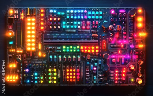 Futuristic circuit board with colorful components, glowing neon lights, intricate patterns, representing advanced innovation and technology, sleek modern design