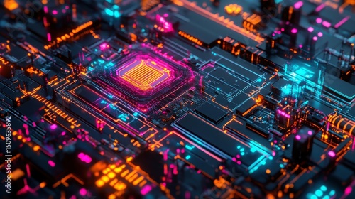 Futuristic Circuit Board with Glowing Components and Intricate Design High Tech and Modern
