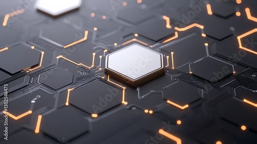 Futuristic circuit board with glowing elements and hexagonal patterns, representing advanced technology and innovation.