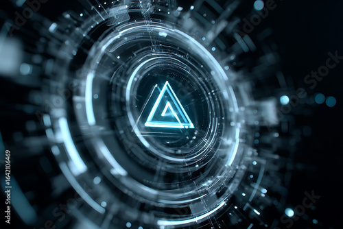 Futuristic circular interface with a glowing blue neon triangle symbol at its core.