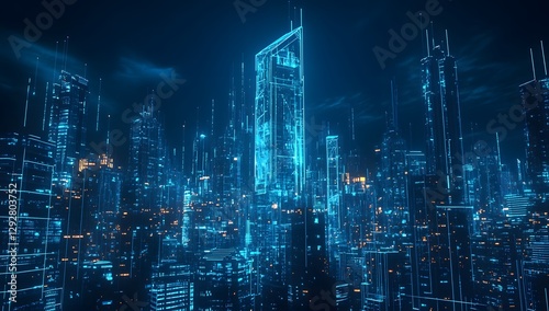 Futuristic city skyline at night with digital lines