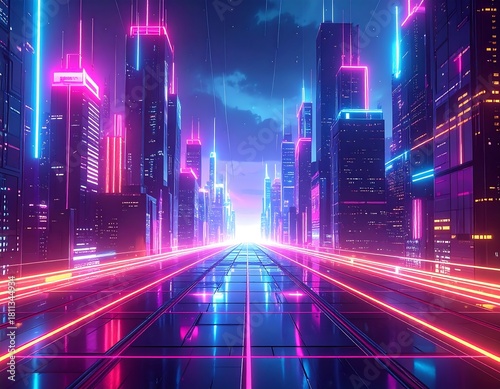 Futuristic city skyline at night with neon-lit buildings and streets