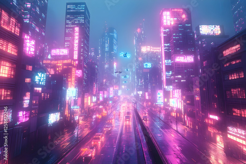 Futuristic city street at night with neon lights and flying vehicles. Possible use Stock photo for futuristic urban scene