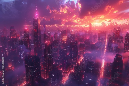 Futuristic city under dramatic pink sky