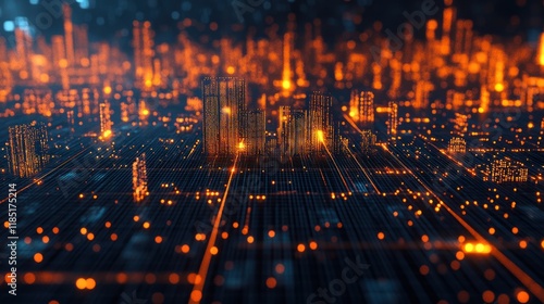Futuristic cityscape illuminated with digital lines and glowing nodes.