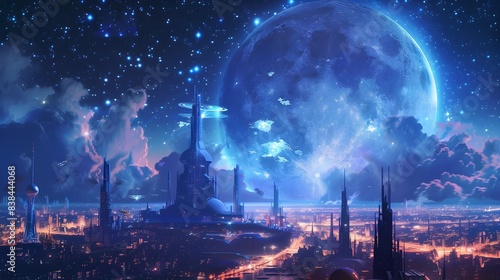 Futuristic Cityscape Under Glowing Alien Planet and Starry Sky