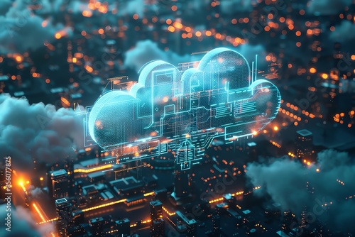 Futuristic cityscape with a glowing cloud computing network. Digital data storage and technology concept. Night view with neon blue lights.