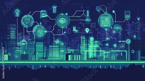 Futuristic cityscape with digital technology and connected devices