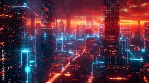 Futuristic cityscape with glowing neon lights and digital connections crisscrossing between skyscrapers at sunset, creating a cyberpunk atmosphere