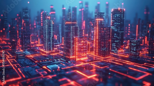 Futuristic cityscape with glowing neon lights and digital elements.