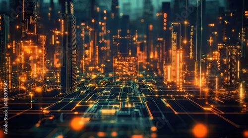 Futuristic cityscape with glowing orange circuits.