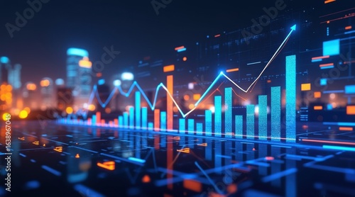Futuristic cityscape with growing financial data visualization