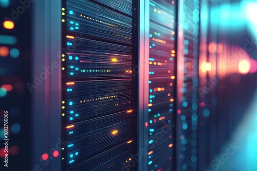 Futuristic close-up of data center server racks glowing with vibrant blue and orange lights, symbolizing high-speed digital infrastructure, cloud computing, and data security