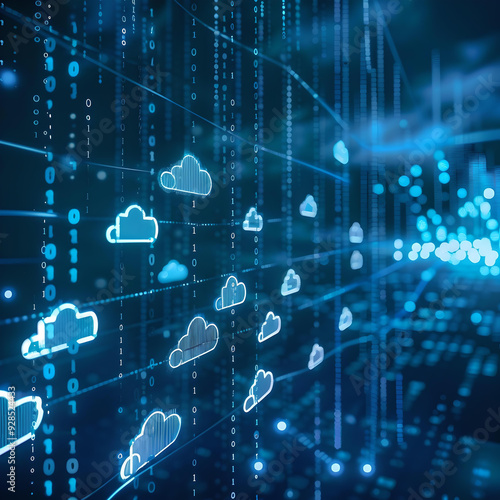 Futuristic Cloud Computing and Big Data Digital Network Background. A futuristic visualization of cloud computing featuring digital cloud icons and binary code in a virtual environment.