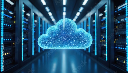 Futuristic cloud computing concept digital cloud graphic floats server room. Data center, internet tech, network infrastructure. Cloud technology, data storage, processing. Modern information tech.