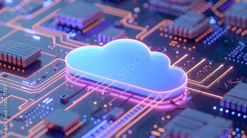 Futuristic cloud computing concept with a glowing cloud icon on a circuit board, representing advanced technology and data processing. 3D Illustration.