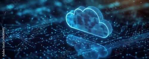 Futuristic cloud computing concept with digital cloud icon surrounded by circuit patterns, symbolizing data storage and technology innovation in a connected digital world