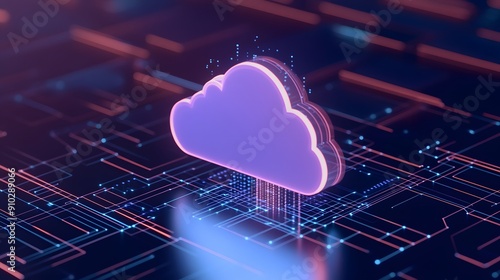 Futuristic cloud computing concept with digital connections and abstract technology background representing data and storage.