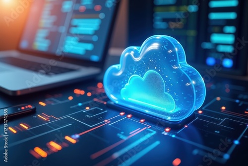 Futuristic Cloud Computing Concept with Glowing Cloud Icon and Digital Background Featuring Laptop and Networking Data Visualizations