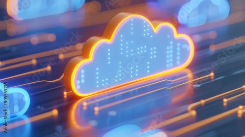 Futuristic cloud computing concept with glowing digital elements, symbolizing data storage and technology advancement.